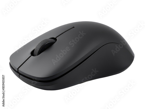 A black computer mouse sits on a white surface, ready for use
