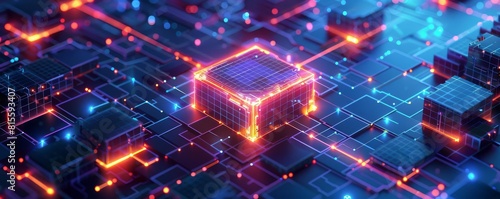 A blockchain network visualized as a protective shield around sensitive AI health data, conceptual, 3D render