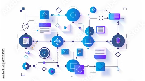 A blue and white image of a computer network with many different icons and shapes. Concept of a complex and interconnected system, with each icon representing a different aspect of the network