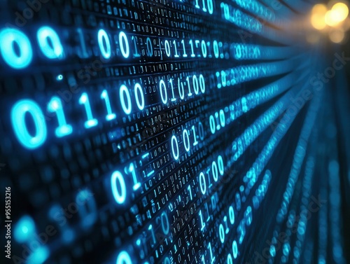 A blue digital binary code streaming on a computer screen, futuristic data flow, glowing digits in a matrix style, tech background