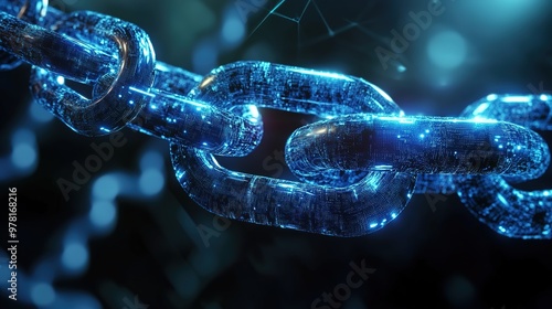 A blue digital chain of blocks being connected, symbolizing the data exchange in blockchain technology.