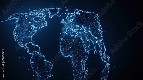 A blue globe with a network of lines connecting the continents. The globe is lit up and he is a computer generated image