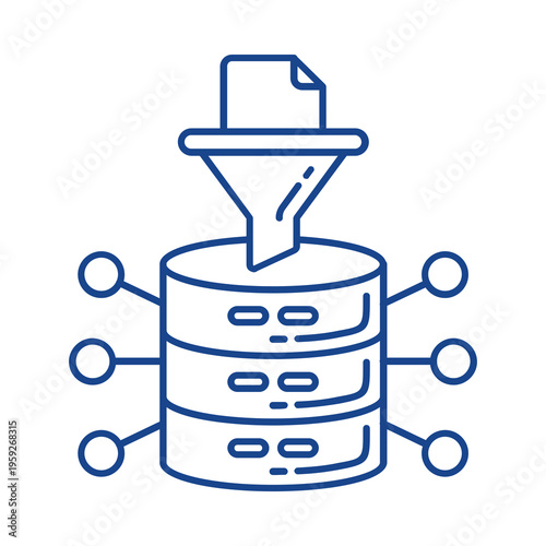 A blue linear icon representing data filtering process into a central database storage structure isolated on transparent background