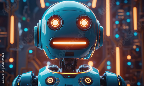 A blue robot with glowing orange eyes looks directly at the camera in a futuristic setting