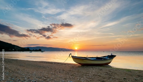 a boat on the beach with sunrise and beautiful sky for nature, tranquility, relaxation