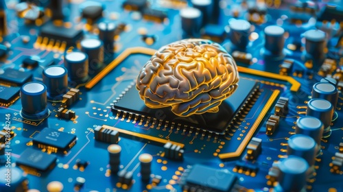 A brain model symbolizes AI technology on a circuit board, blending digital innovation and cuttingedge computing