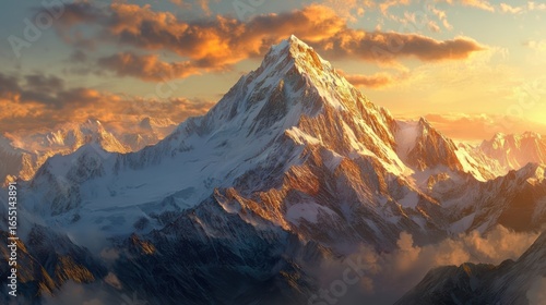A breathtaking mountain peak stands tall against a colorful sunset, surrounded by majestic snow-capped ranges and fluffy clouds.