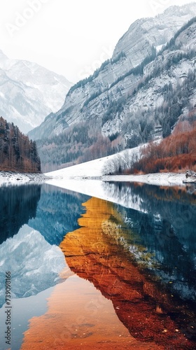 A breathtaking painting of a serene lake reflecting the vibrant colors of snow-capped mountains, surrounded by a majestic landscape with clear blue skies and fluffy white clouds.