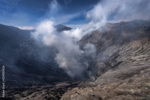 A breathtaking volcanic crater, Bromo volcano, is actively emitting smoke, surrounded by majestic towering mountains that rise high beneath a clear blue sky, creating a stunning view, Java, Indonesia