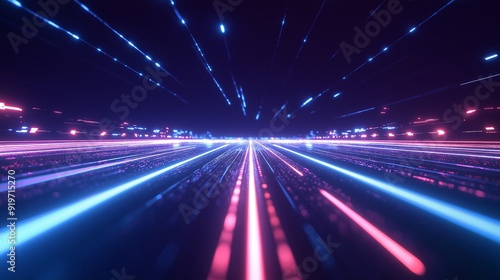 A bright blue and red cityscape with a lot of lights, synthwave background