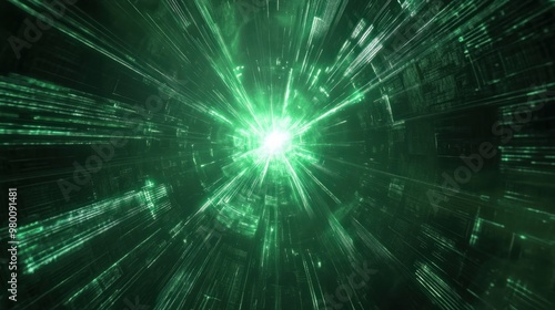 A burst of green light shining from the center, casting vibrant beams in all directions for a sci-fi look.