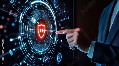 A business executive presenting cybersecurity risk assessments to the team using a digital display.