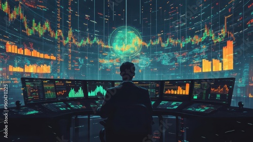 A business radar system displaying the rise and fall of stock prices, with a businessperson making realtime decisions based on the data