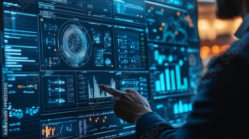 A businessman analyzes data on a screen filled with graphs, charts, and digital information. This symbolizes the use of data-driven insights for marketing automation, improved efficiency, and business