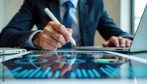 A businessman in a suit analyzes financial data on a digital tablet displaying colorful 3D bar and line graphs, symbolizing growth and performance metrics in a modern office setting.