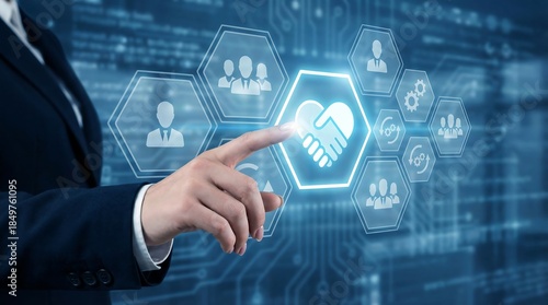 A businessman interacts with a digital interface representing partnership and collaboration, symbolizing modern business strategies and innovative technologies.