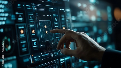 A businessman is touching a virtual screen by hand