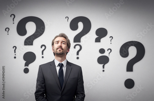 A businessman man is in thought, standing against a gray wall with question marks.. Generative AI.