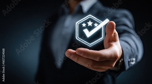 A businessman presents a glowing quality assurance symbol, signifying high standards and verified excellence