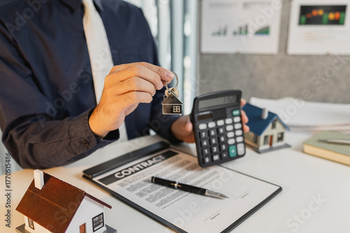 A businessman presents house models, keys, and contract documents, highlighting property investment and mortgage agreements, symbolizing home ownership, finance, and real estate success.