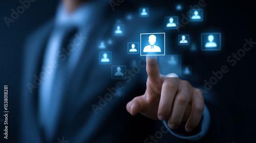 A businessman selecting a digital user icon from a network interface to symbolize digital communication.
