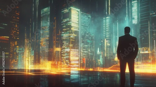 A businessman watching a live stock exchange feed, futuristic office setting with glowing data streams and charts