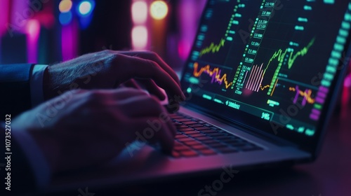 A businessman working on a laptop with a graph of stock market data on the screen, with colorful lights in the background.
