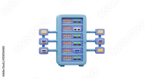 A cartoon server rack with multiple connections and lights isolated on a plain white background render
