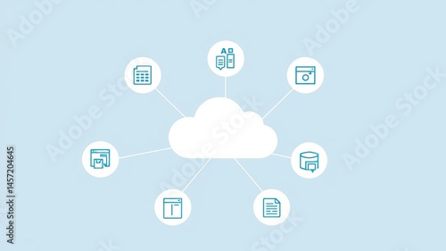 A central cloud server connects multiple digital devices and applications including documents spreadsheets and databases for efficient data