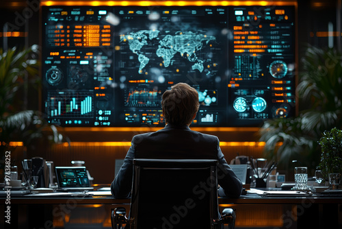 A CEO addressing a board meeting in a stylish boardroom, with detailed reports and strategic plans displayed on a large screen.