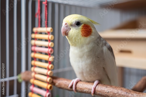 A cheerful cockatiel is sitting on a wooden perch within a spacious birdcage. Brightly colored toys hang alongside, creating a lively and playful environment for the bird