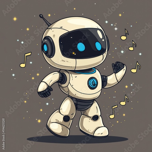 A cheerful robot character dancing with musical notes around it.