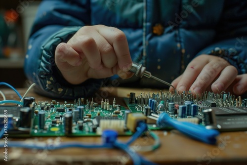 A child boy does robotics, microelectronics. Hobby. Chip. Additional session. Physics at school