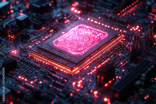 a chip on a computer circuit board that glows with bright red and pink neon lines, creating a futuristic design effect.