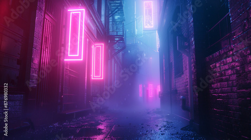A cinematic scene of urban noir with neon lights illuminating the foggy alleyways.