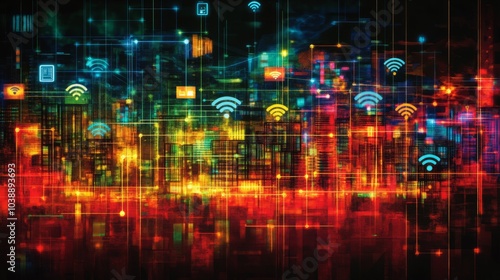 A city skyline with glowing network connections and icons.