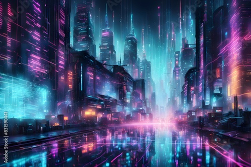 A cityscape with neon lights and a reflection of the city in the water