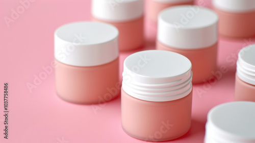 A clean set of white cosmetic containers resting on a soft pink backdrop, perfect for elegant branding mockups.