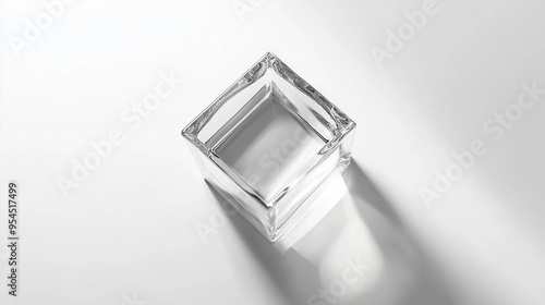 A clear glass cube filled with water, casting a subtle shadow on a light surface.