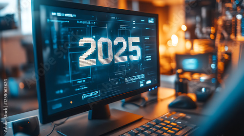 A Close Up Shot of a Computer Screen Displaying the Number 2025 in Glowing White Digits Against a Dark Blue Digital Background with Circuit Board Pattern
