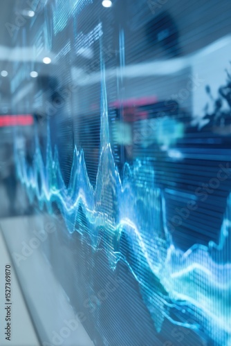 A close up view of a blue line graph displayed on a screen with blurry background reflections visible