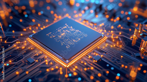 A close up view of computer microchip surrounded by glowing circuitry, showcasing intricate details and vibrant colors that evoke sense of advanced technology and innovation