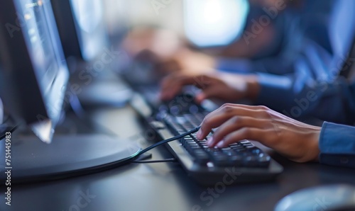 A close-up image of a call center operator's hands as they navigate through computer screens and type on a keyboard during a call