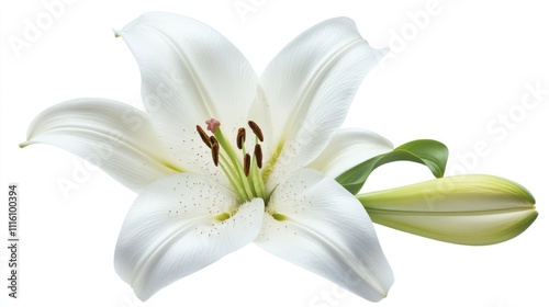 A close-up of a beautiful white lily flower with a bud and green leaves.