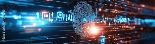 A closeup of a biometric fingerprint scan, with digital security icons and binary code subtly overlaying the image