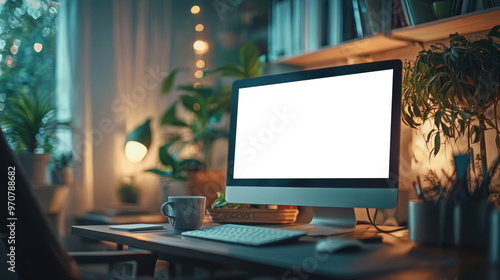 A close-up of a blank computer screen in a cozy home office setting with plants