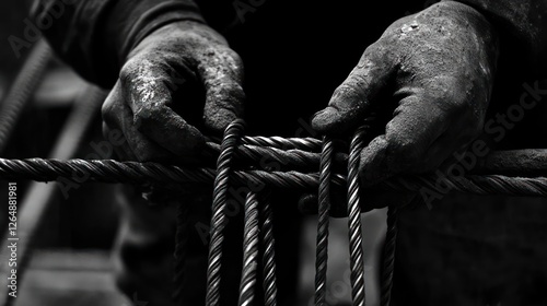 A close-up of a building's steel reinforcement bars being tied together, with the worker’s hands in focus.