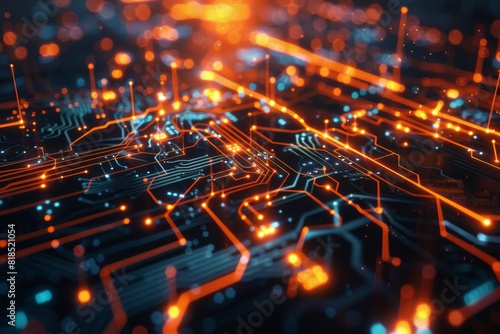 A close-up of a computer chip with AI algorithms represented by glowing lines and data streams