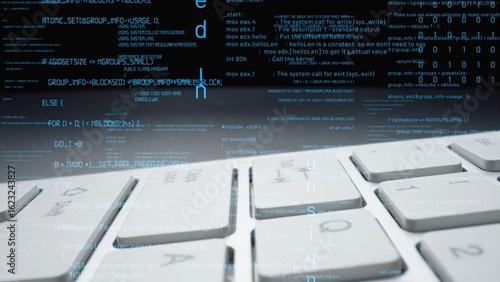A close-up of a computer keyboard surrounded by floating digital code and data, illustrating themes of technology, programming, and modern communication in a digital world. Xenic