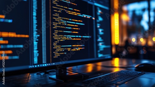 A close-up of a computer screen displaying colorful code in a dark environment.